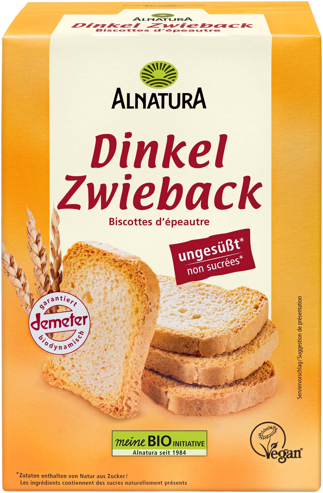 Ein Bio-Zwieback, dessen Hauptzutaten Dinkelmehl und -schrot in Demeter-Qualität sind. Pur geknabbert perfekt als Zwischendurch-Genuss, der auch mit süßem oder herzhaftem Belag schmeckt. Der Alnatura Dinkelzwieback ist ungesüßt (Zutaten enthalten von Natur aus Zucker) und vegan.