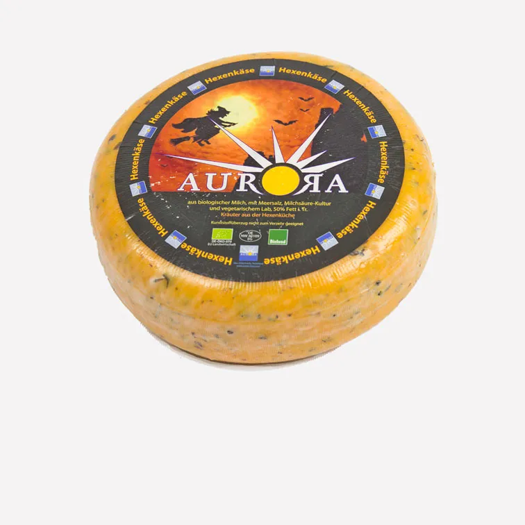 Laß Dich von dem außergewöhnlichen Hexenkäse von Aurora überraschen. Er ist mit Kräutern aus der Hexenküche verfeinert. Zum Glück sind es keine Spinnenbeine und Krötenaugen, sondern Waldmeister, rosa Pfeffer und Möhrensaft. Der Teig ist sehr cremig mit einem milden Waldmeisteraroma. Der Käse paßt gut zu Salat, zur Brotzeit und als aromatischer Snack für Zwischendurch.