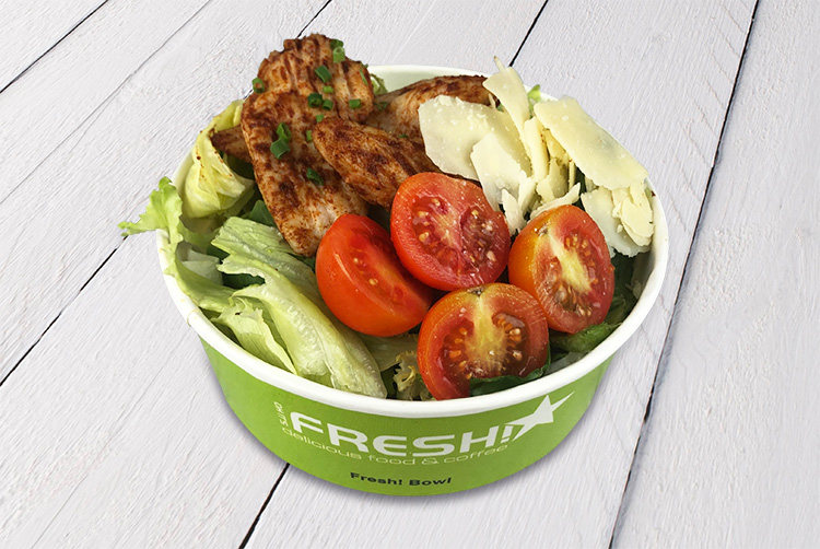 Salat mit Hühnerbrusttranchen, Parmesan, Tomate und Croutons. Auf Wunsch liefern wir Ihnen gerne frisches Baguettebrot und Servietten dazu. Bitte geben Sie uns einen entsprechenden Hinweis im Feld Bemerkungen am Ende der Bestellung.