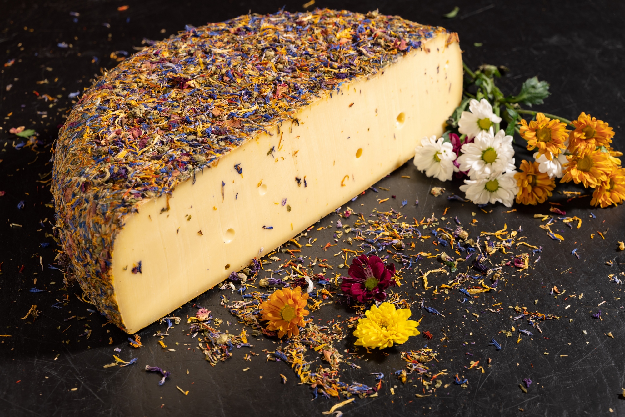 Mild-cremige Schnittkäse veredelt mit einer kostbaren, essbaren und blumig-duftenden Bergblumenmischung.
