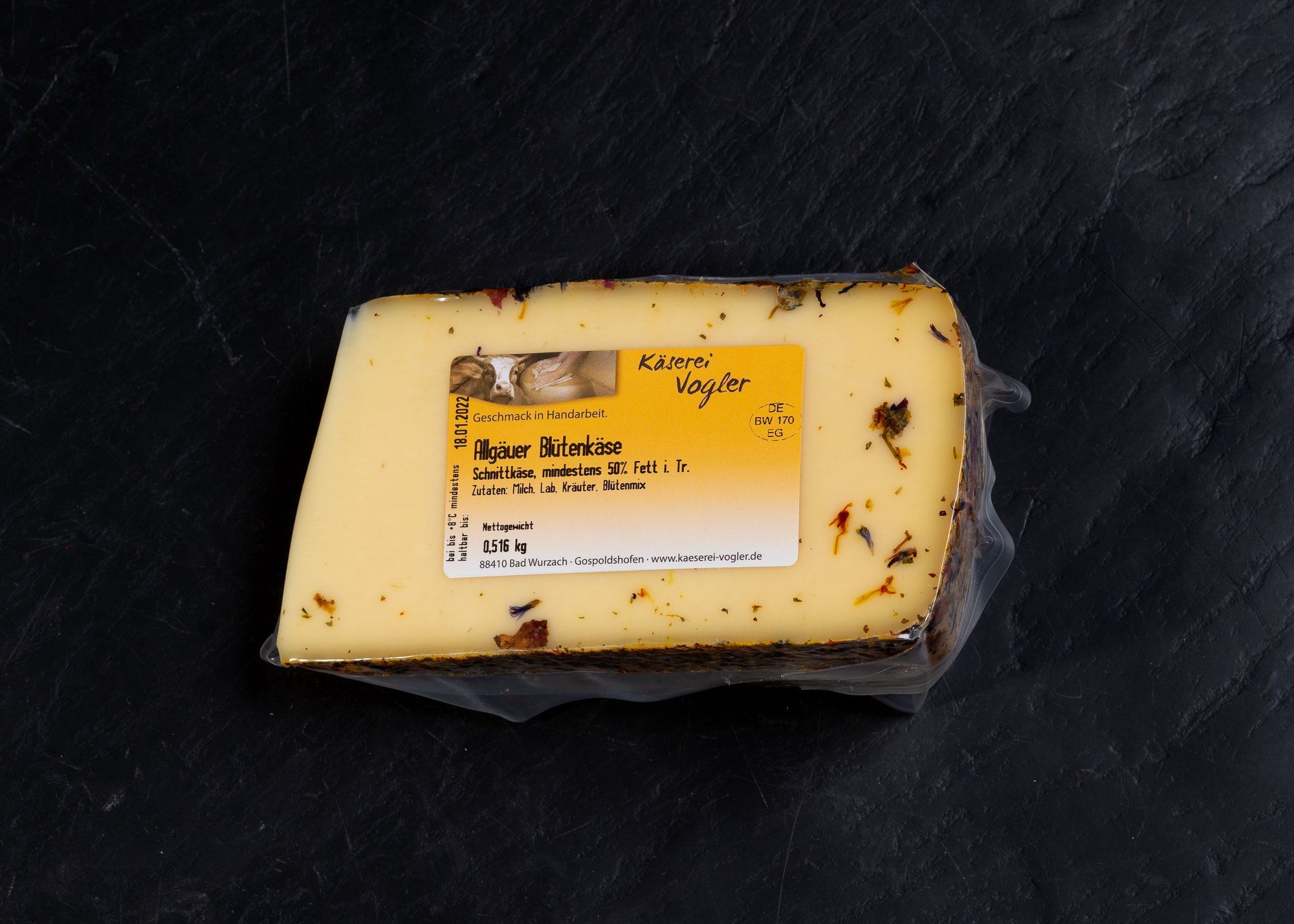 Der mind. 8 Wochen gereifte Schnittkäse aus 100 % Milch aus dem Allgäu ist umhüllt und veredelt mit einer kostbaren, essbaren und blumig-duftenden Bergblumenmischung.