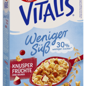 Vitalis Weniger Süß Knusper Schoko ist das Knusper-Schokomüsli für all die, die es gern etwas weniger süß mögen. Knusprige Crunchies und zarte Schokoladen-Blättchen machen dieses Produkt zu einem echten Genuss und das bei 30% weniger Zucker als andere Knusper-Schokomüslis.