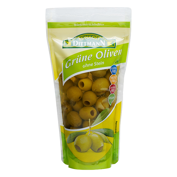 Die Feinkost Dittmann Oliven grün ohne Stein sind auch im Glas erhältlich oder im Beutel mit Stein.
