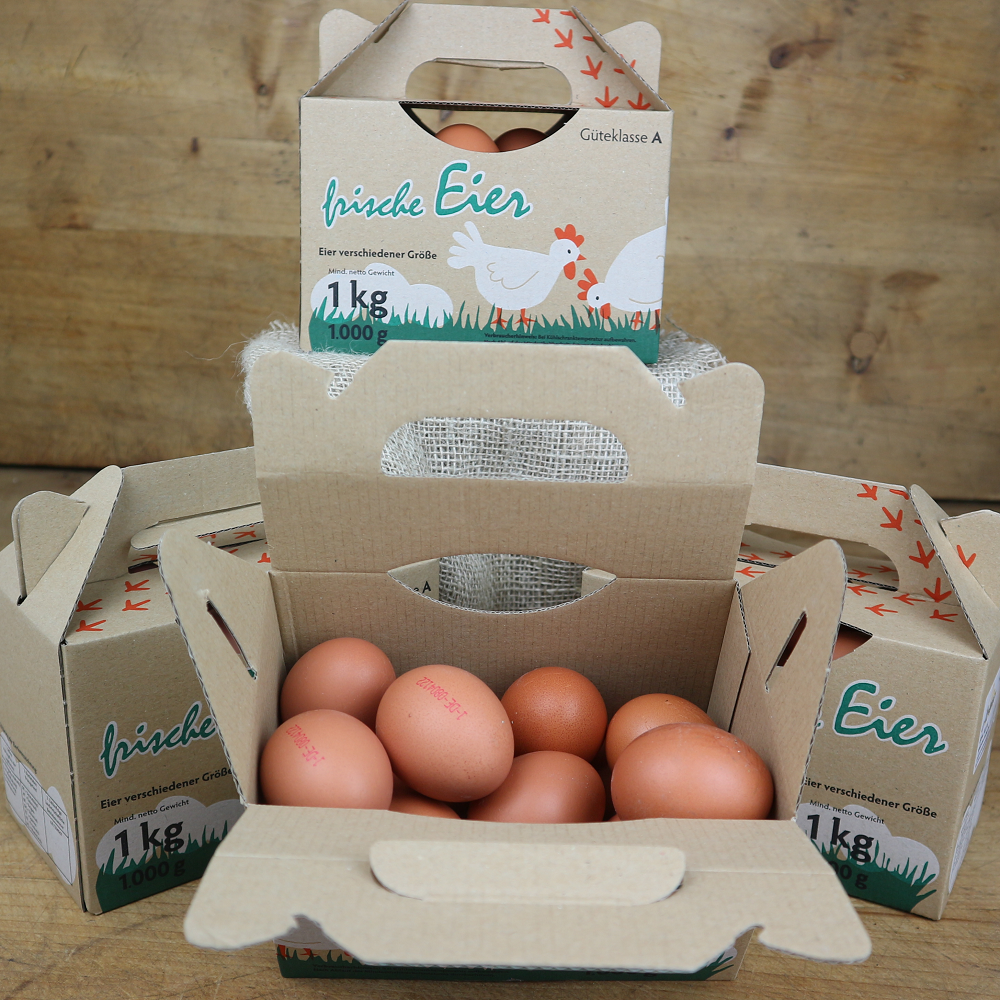 Unsere beliebten Freilandeier in der 1KG Eier-Box (Inhalt entspricht ca. 15 bis 18 Eier, Anzahl variiert je nach Größe).