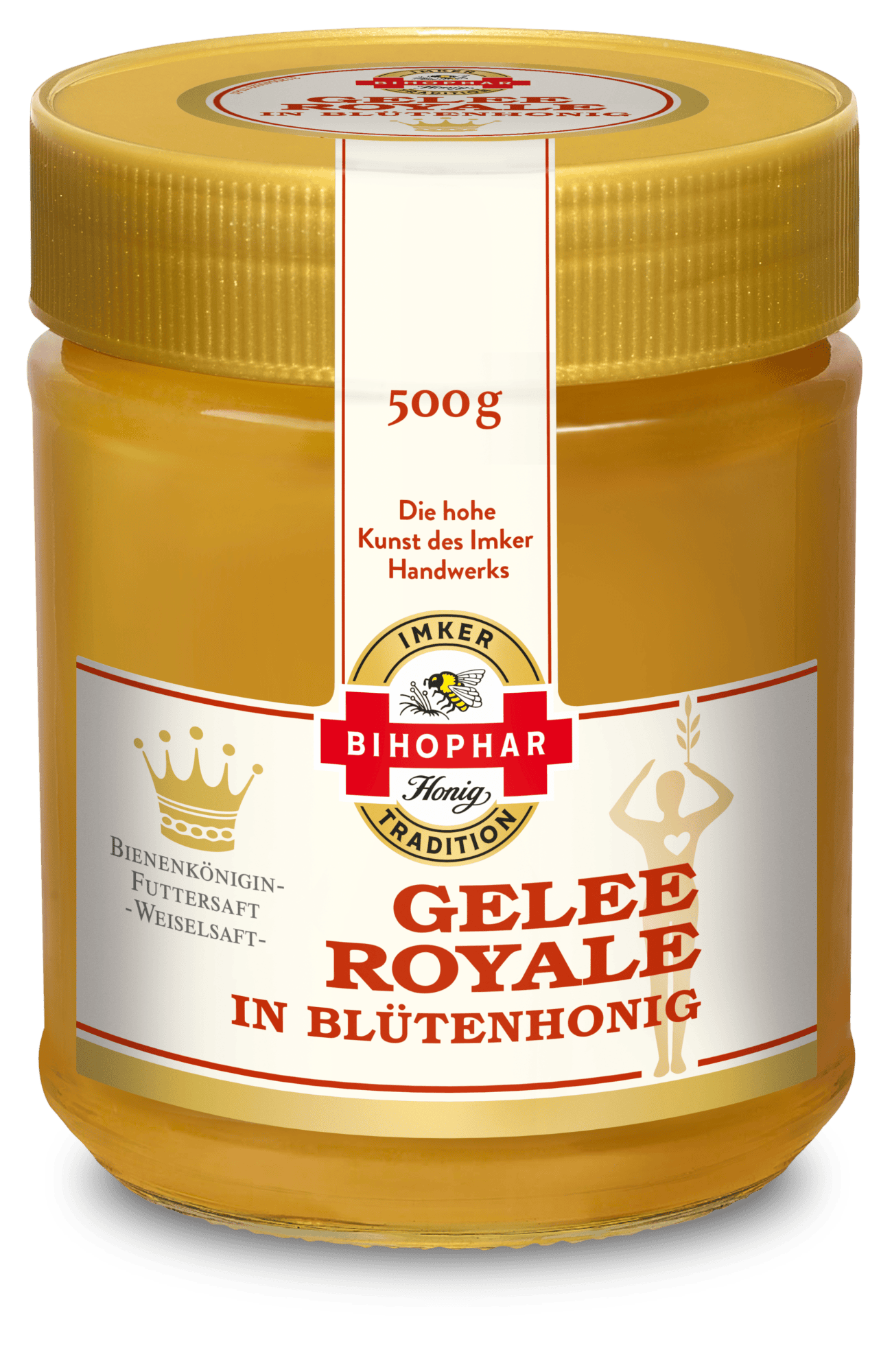 Frisches Gelée Royale wird bei diesem BIHOPHAR®-Produkt auf natürliche Weise in einer Dosierung von 5.000 mg / 500 g in ausgewähltem Blütenhonig stabilisiert und so dem menschlichen Verzehr zugänglich gemacht.