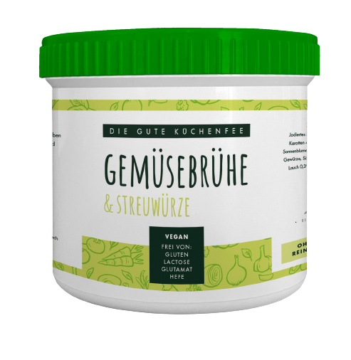 Für eine fertige Gemüsebrühe rühren Sie 20g (ca. 1 Esslöffel) in 1 Liter warmes Wasser ein – fertig.