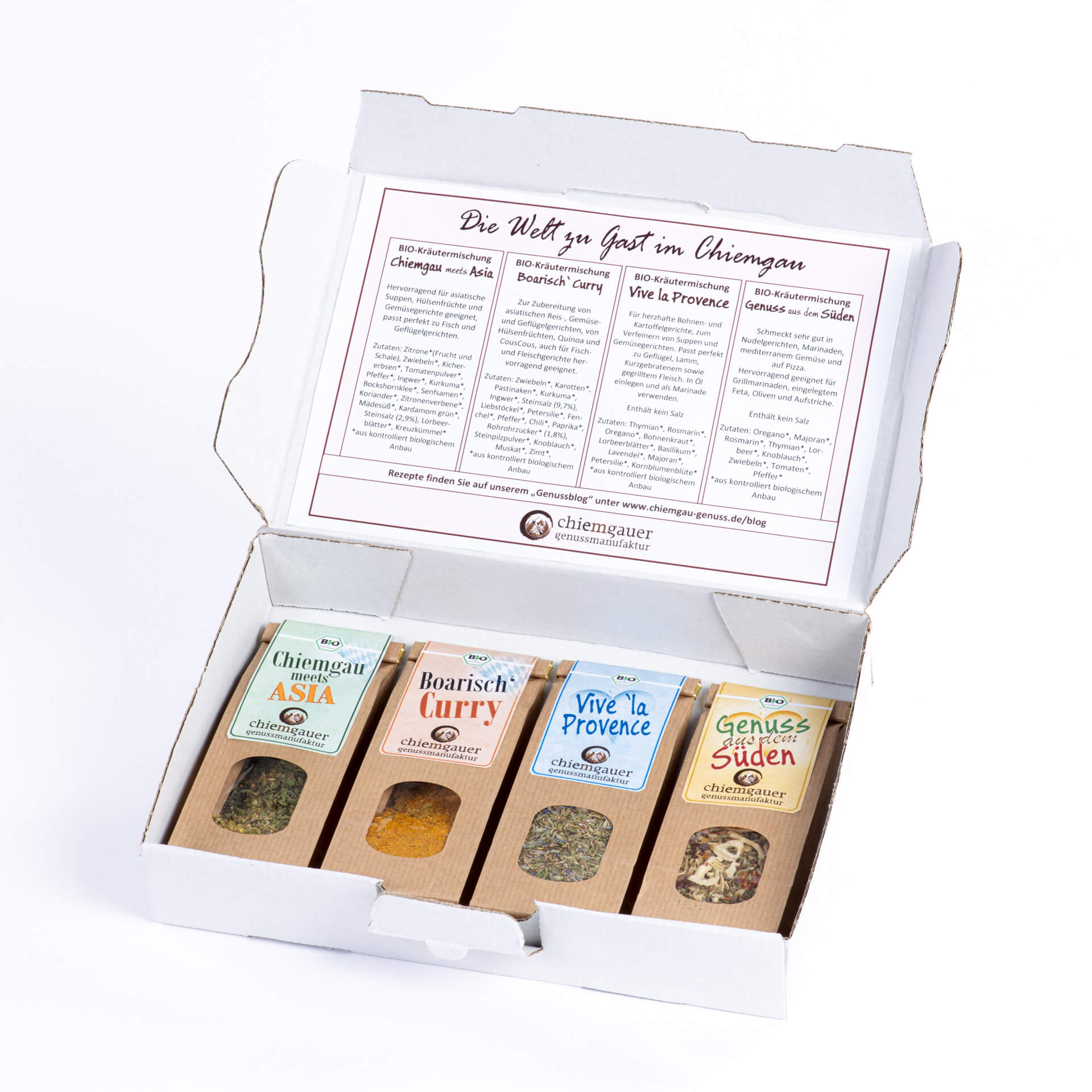 Mit unserer Genussbox bereiten Sie jedem Genießer eine Freude! Eine exklusive Auswahl unserer Kräuter- und Gewürzmischungen aus aller Welt zum Testen, Probieren und Verschenken. Zusätzlich beinhaltet jede Genussbox verschiedene Rezeptvorschläge für Genießer – einfach zum Nachkochen und extrem lecker!