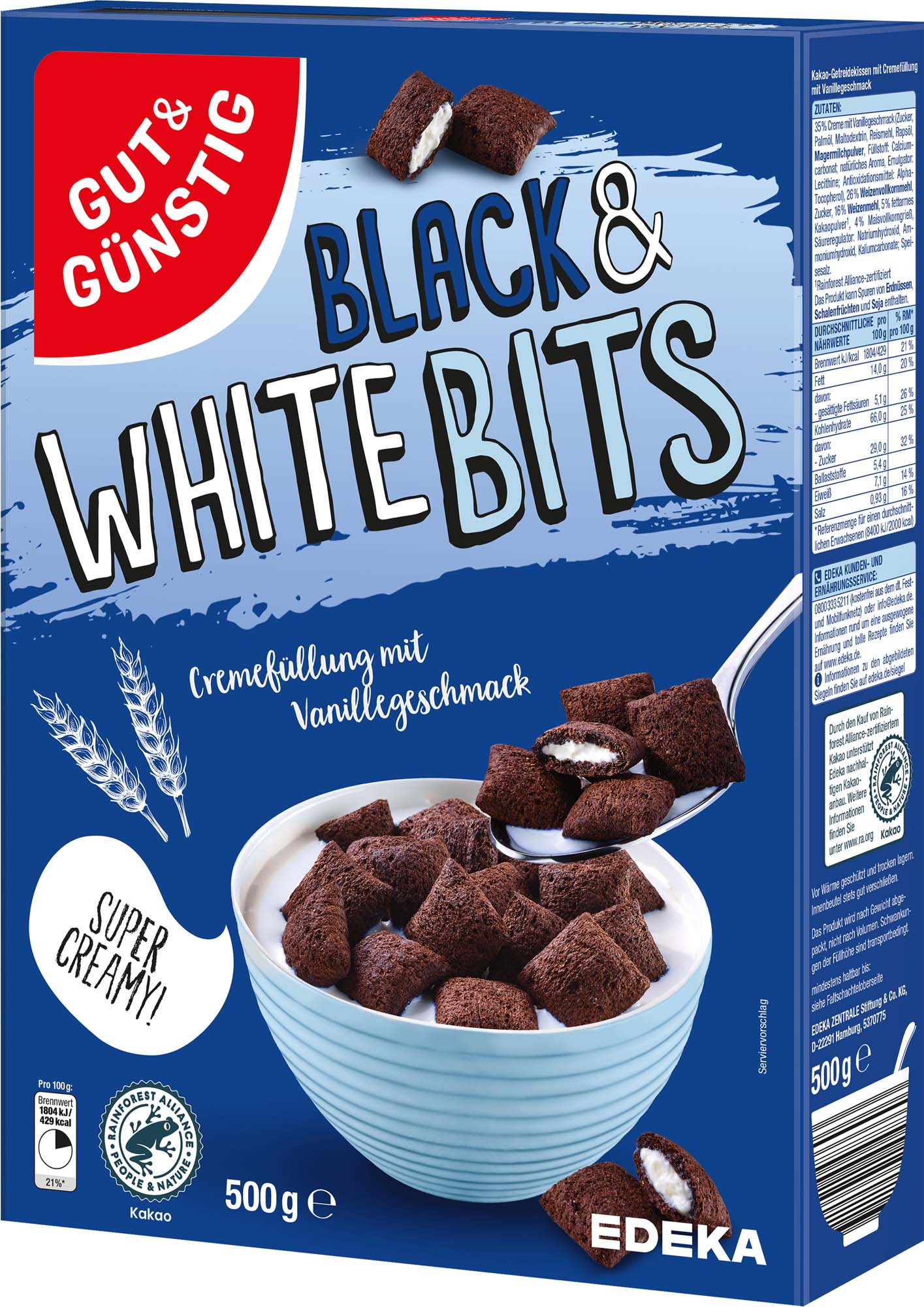 Knusprig-schokoladige Hülle; Cremefüllung mit Vanillegeschmack; Mit Rainforest-Alliance-zertifiziertem Kakao