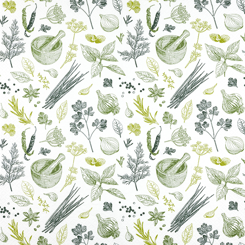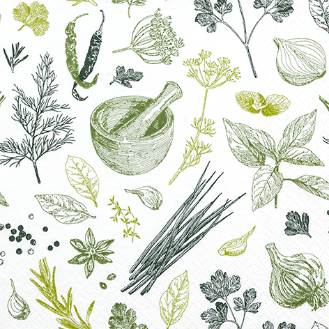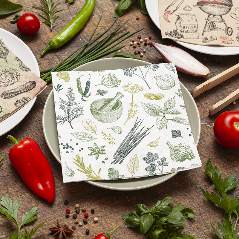 Unsere Herbs and Spices Servietten vereinen Stil und Funktionalität für jeden Anlass. Perfekt für naturverbundene Dekorateure und Feiern mit einer Note von Eleganz und Frische.