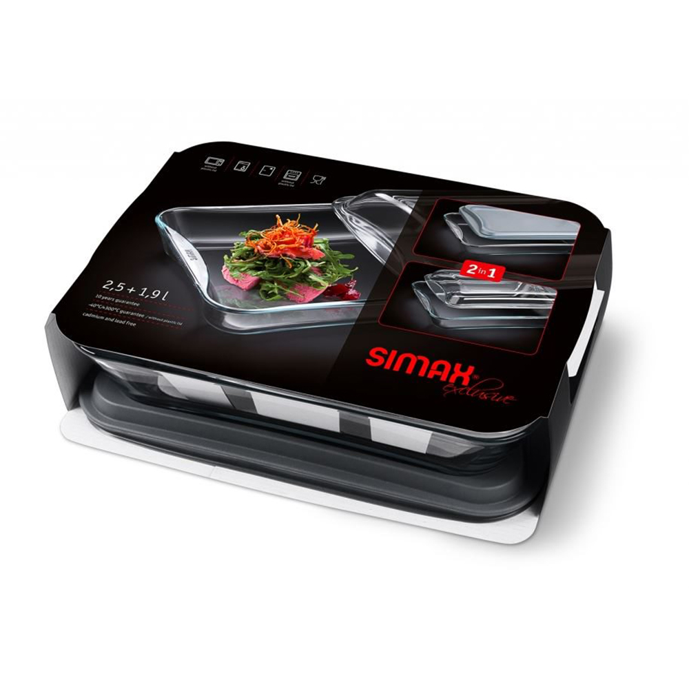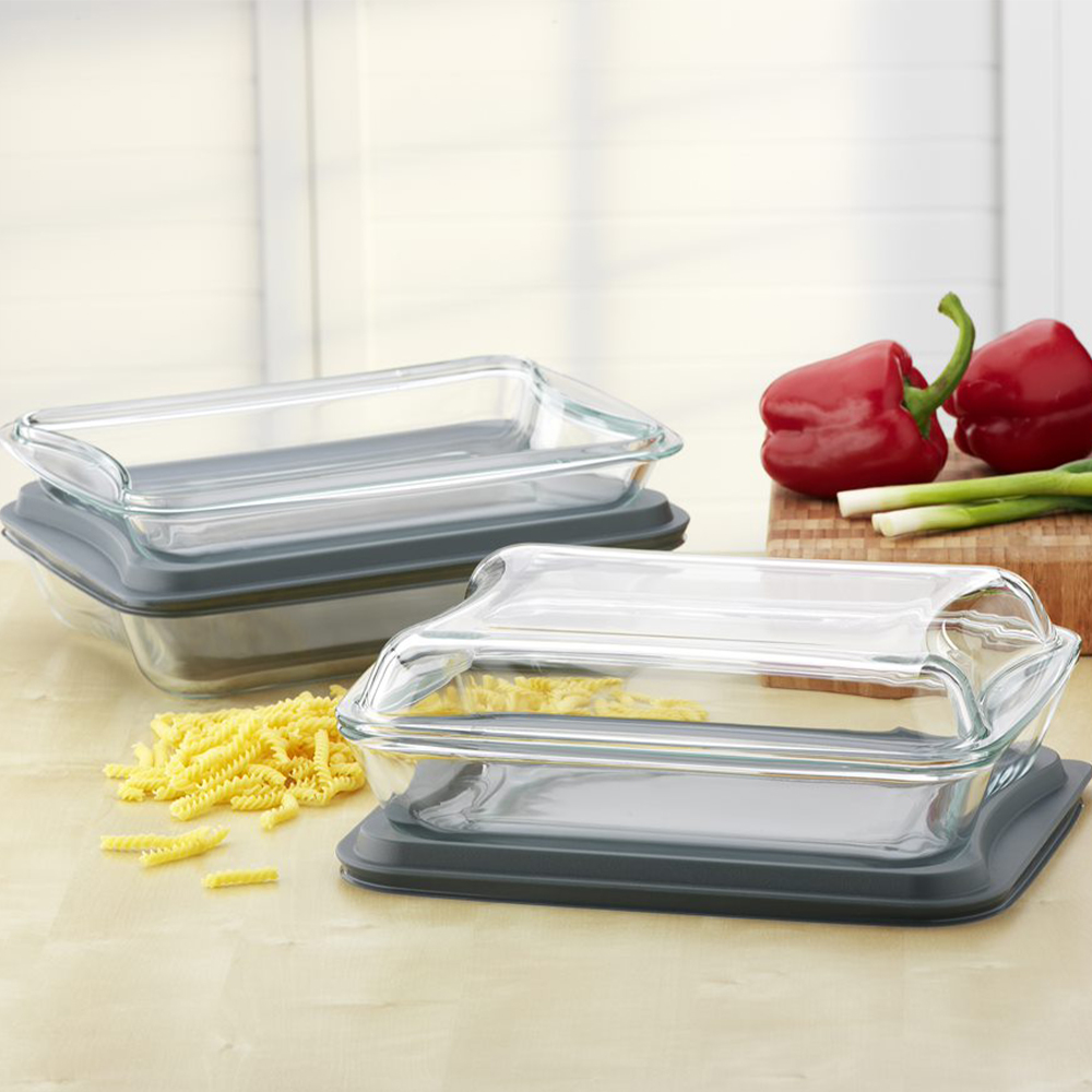 Brat – und Backschale (Schüssel, Auflaufform oder Kasserolle) rechteckige Form mit Glas – und Plastikdeckel. So kann man die Form auch luftdicht verschließen und im Kühlschrank oder Tiefkühlfach aufbewahren und gut transportieren.
