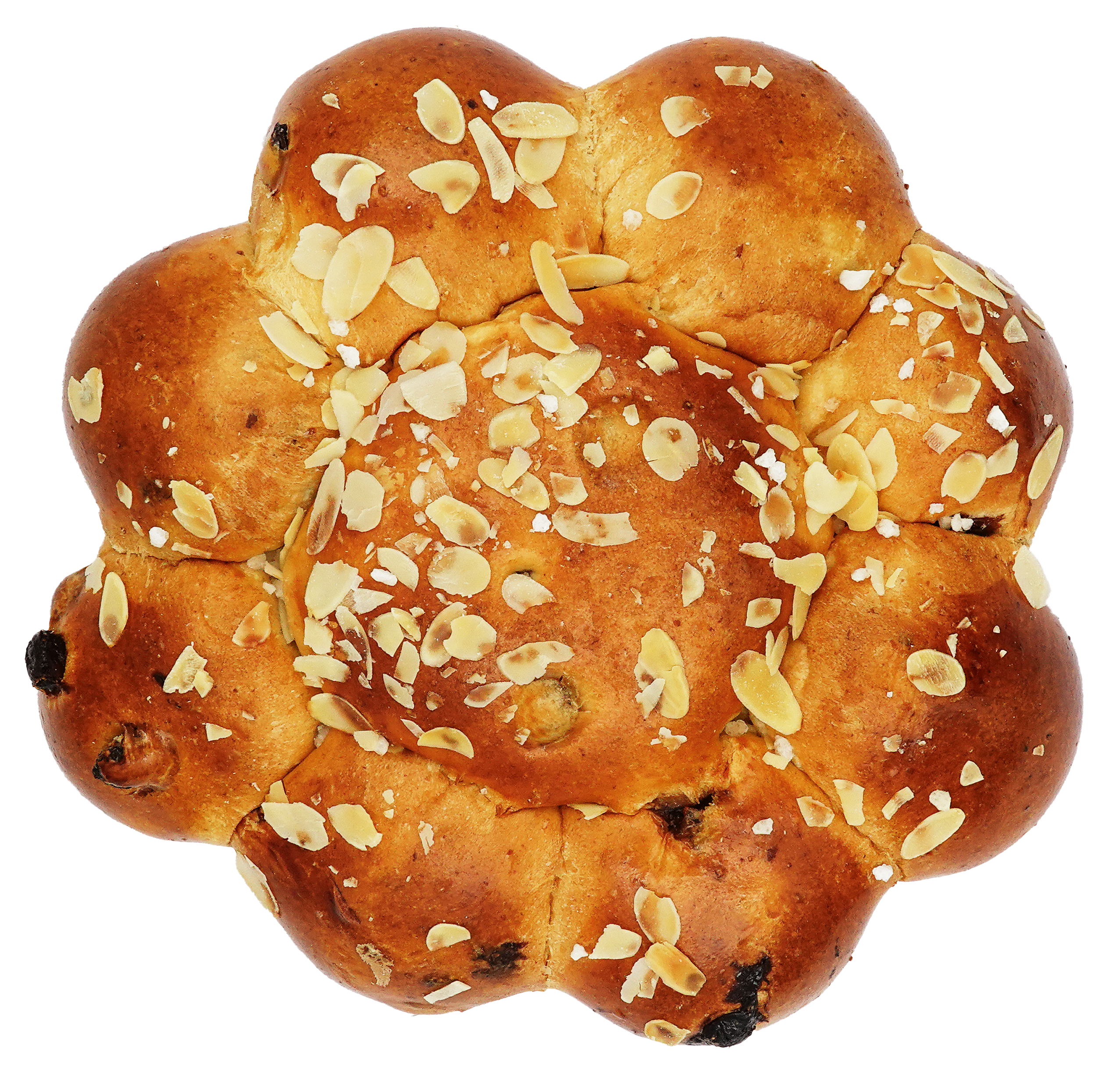 Luftiger Hefesüssteig mit Butter, Mandelmasse und saftigen Sultaninen verfeinert. Garniert mit gehobelten Mandeln und Hagelzucker.