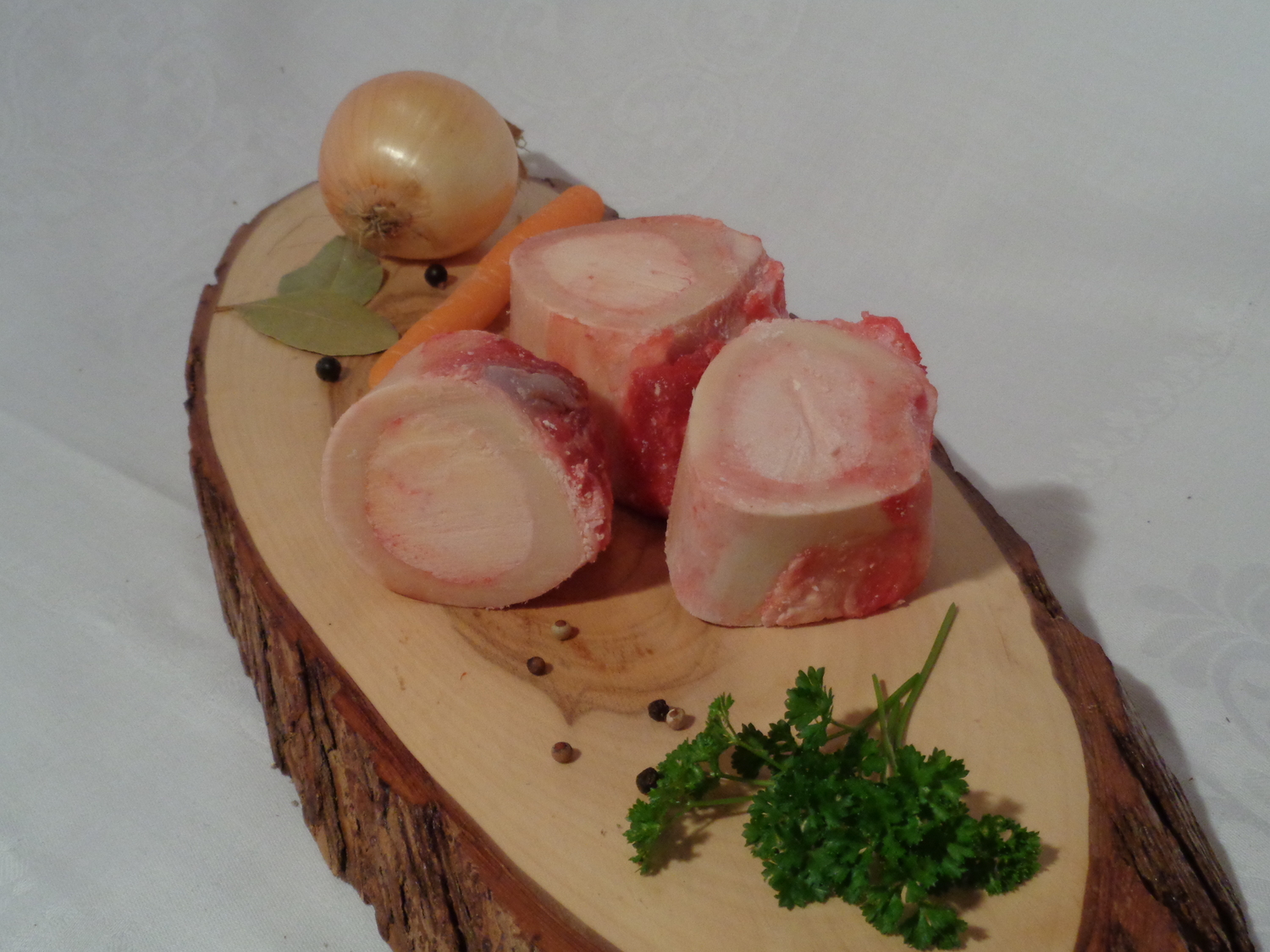 Frisch gesägte Markknochen, je nach Größe in circa 2-3 cm dicke Stücke gesägt. Entweder als Suppenknochen oder für hausgemachte Markklößchen.