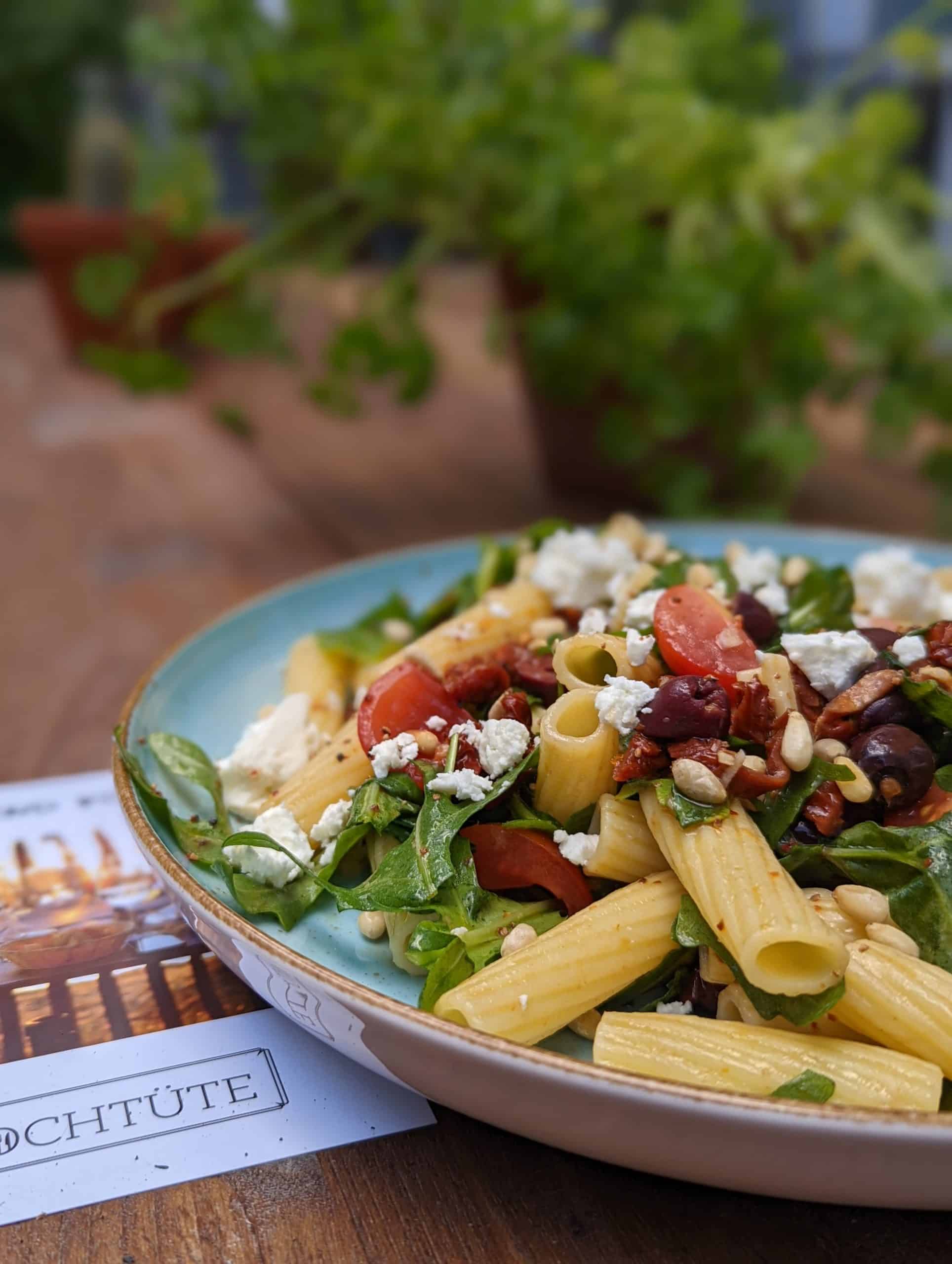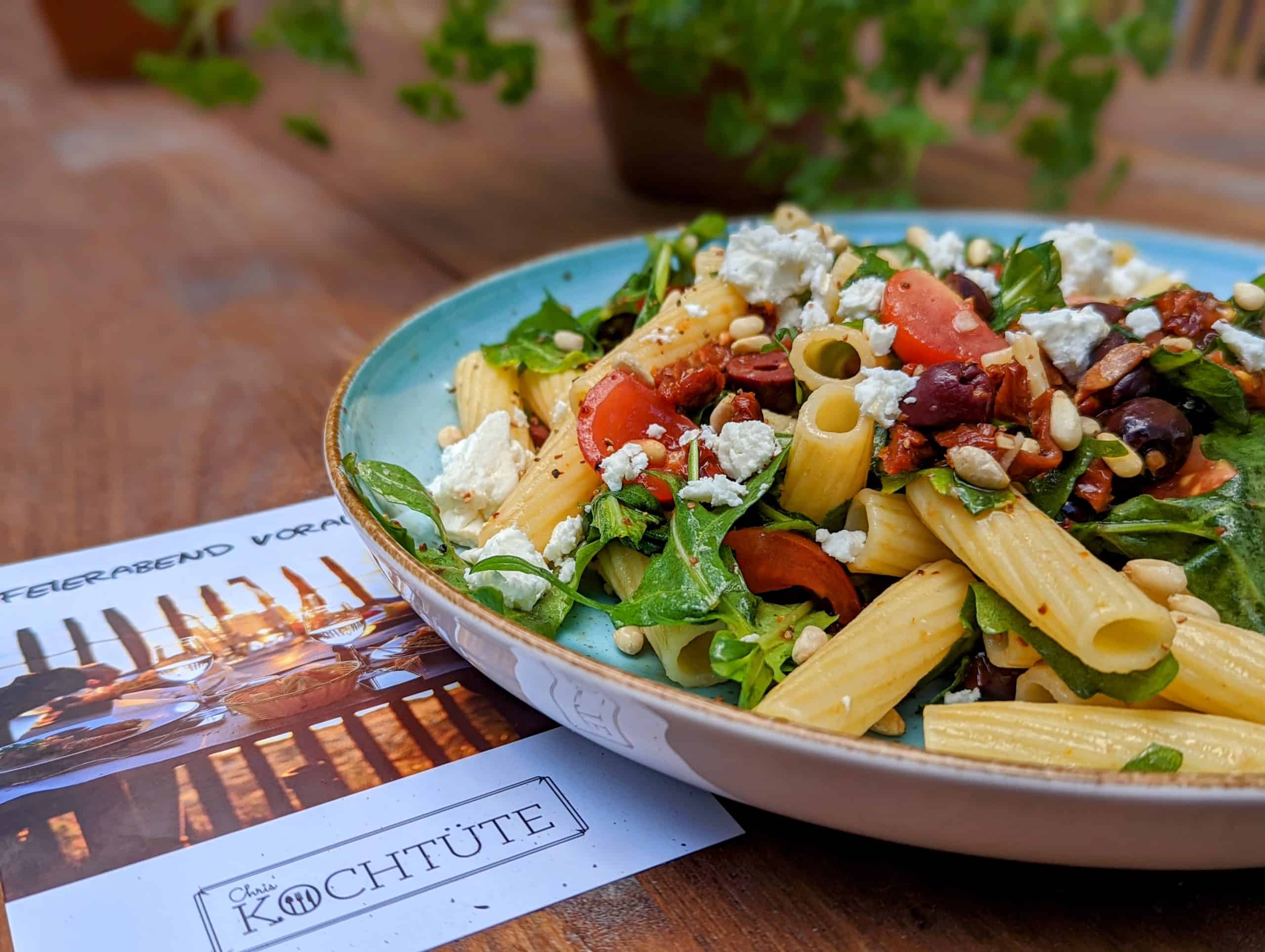 Geht immer: Nudelsalat. Diesmal schön mediterran mit Cocktail- und getrockneten Tomaten, Kalamata-Oliven, Feta und angerösteten Pinienkernen. Hmmm…. Wenn das Wetter mitmacht auch perfekt für’s Picknick geeignet 🙂