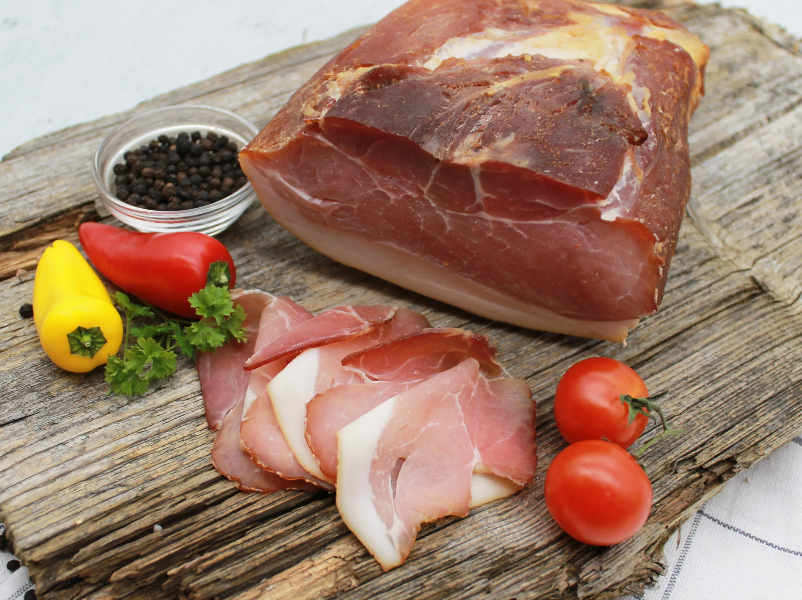 Mit seinem zarten, leicht nussigen Geschmack und der charakteristischen Würze ist unser Rohschinken ein Genuss für die Sinne. Ob pur als delikater Snack, fein geschnitten auf einem rustikalen Brot oder als edle Zutat in anspruchsvollen Gerichten – dieser Schinken verleiht jedem Anlass das gewisse Etwas.