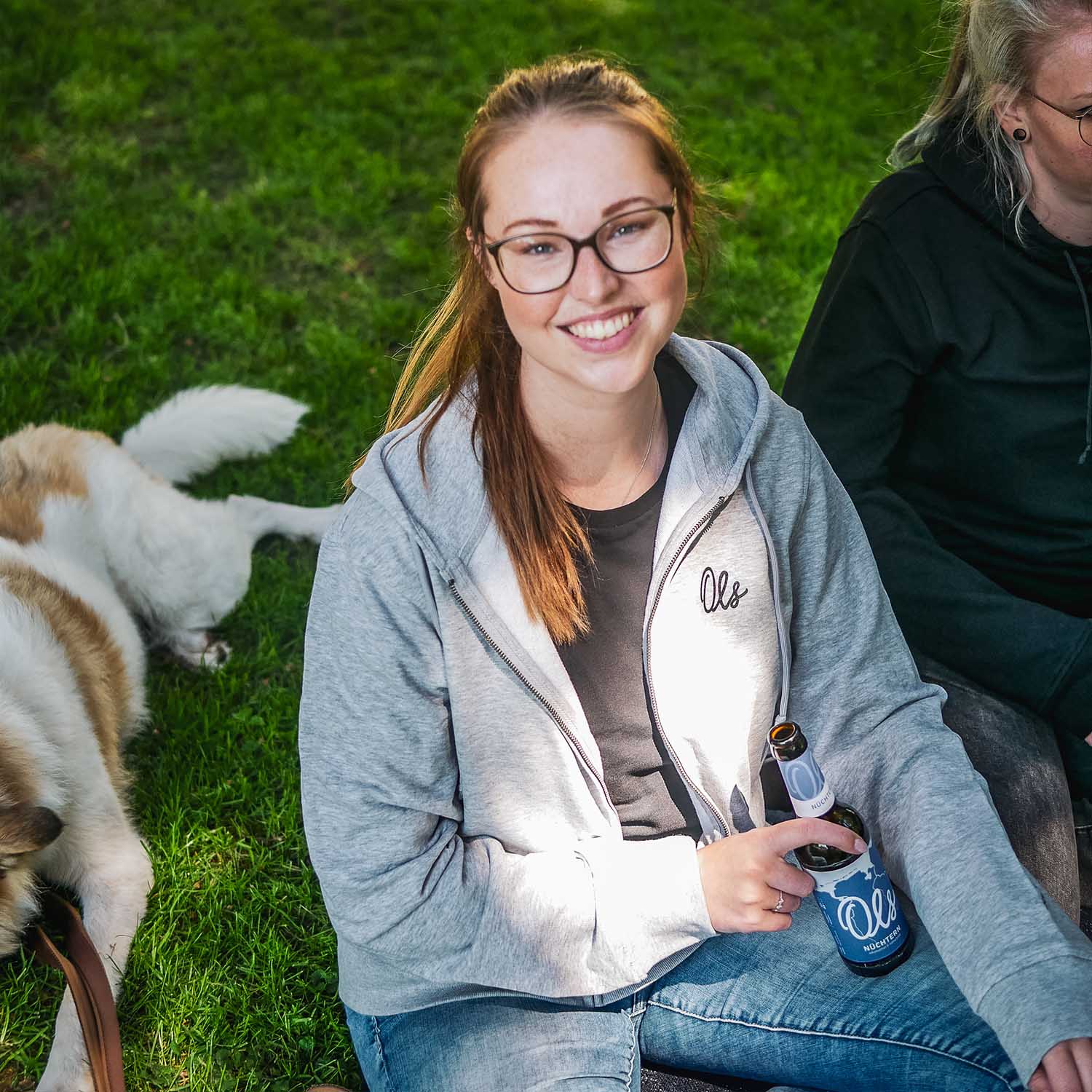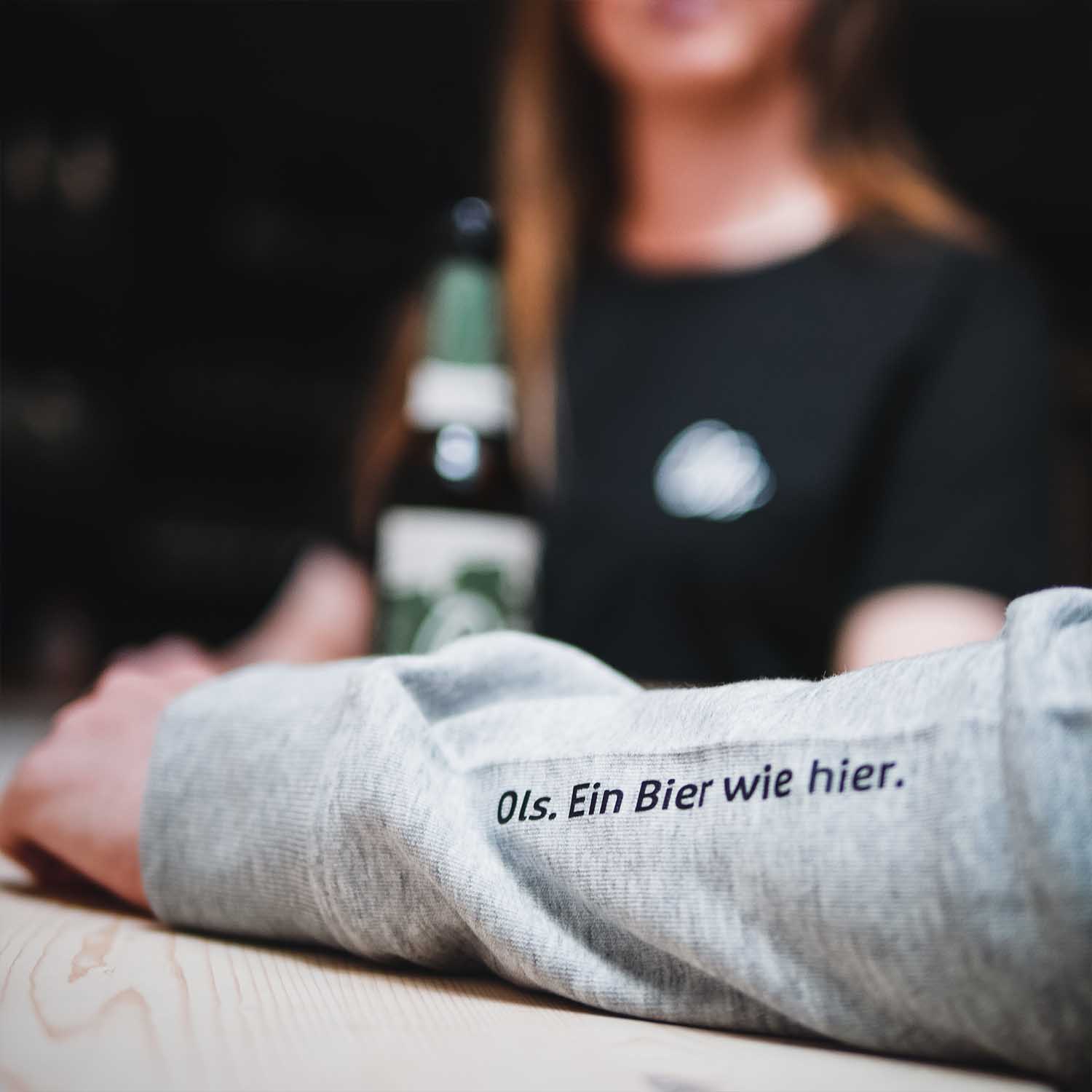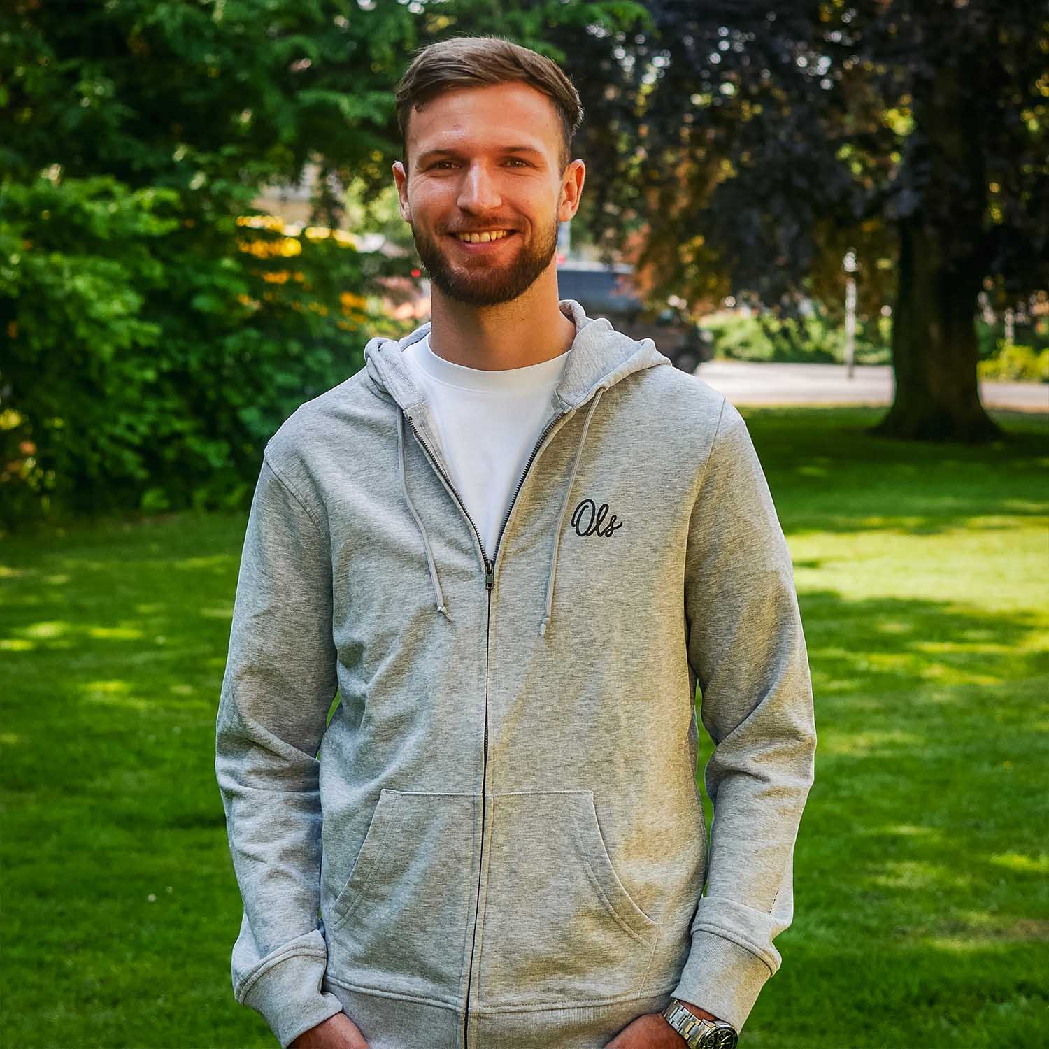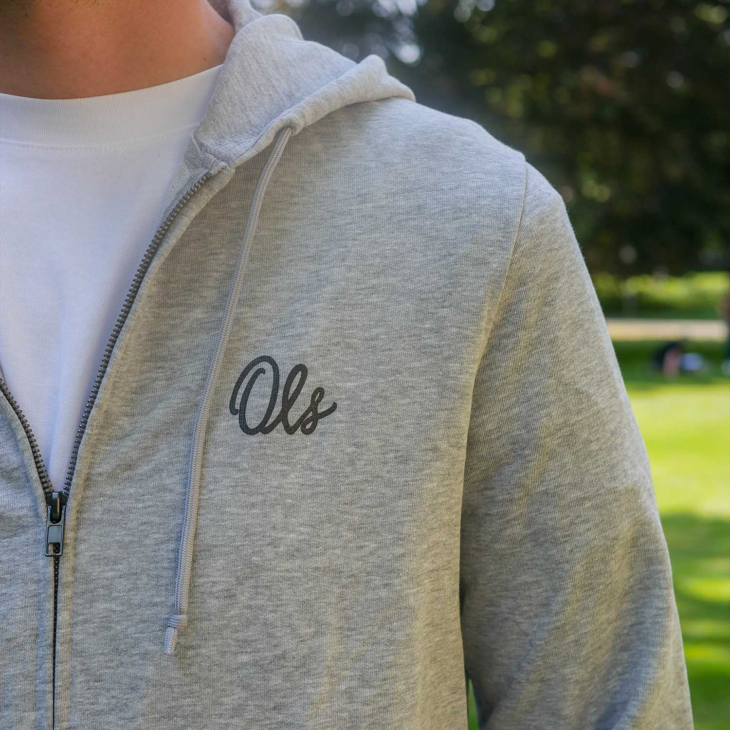 Grauer Ols Zipper für Damen und Herren mit schwarzen Logo auf der Brust.