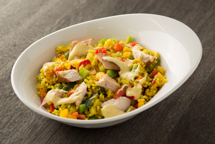 Reissalat mit Hühnerbruststücken, Paprika, Lauch und hausgemachter Currycreme. Auf Wunsch liefern wir Ihnen gerne frisches Baguettebrot und Servietten dazu. Bitte geben Sie uns einen entsprechenden Hinweis im Feld Bemerkungen am Ende der Bestellung.