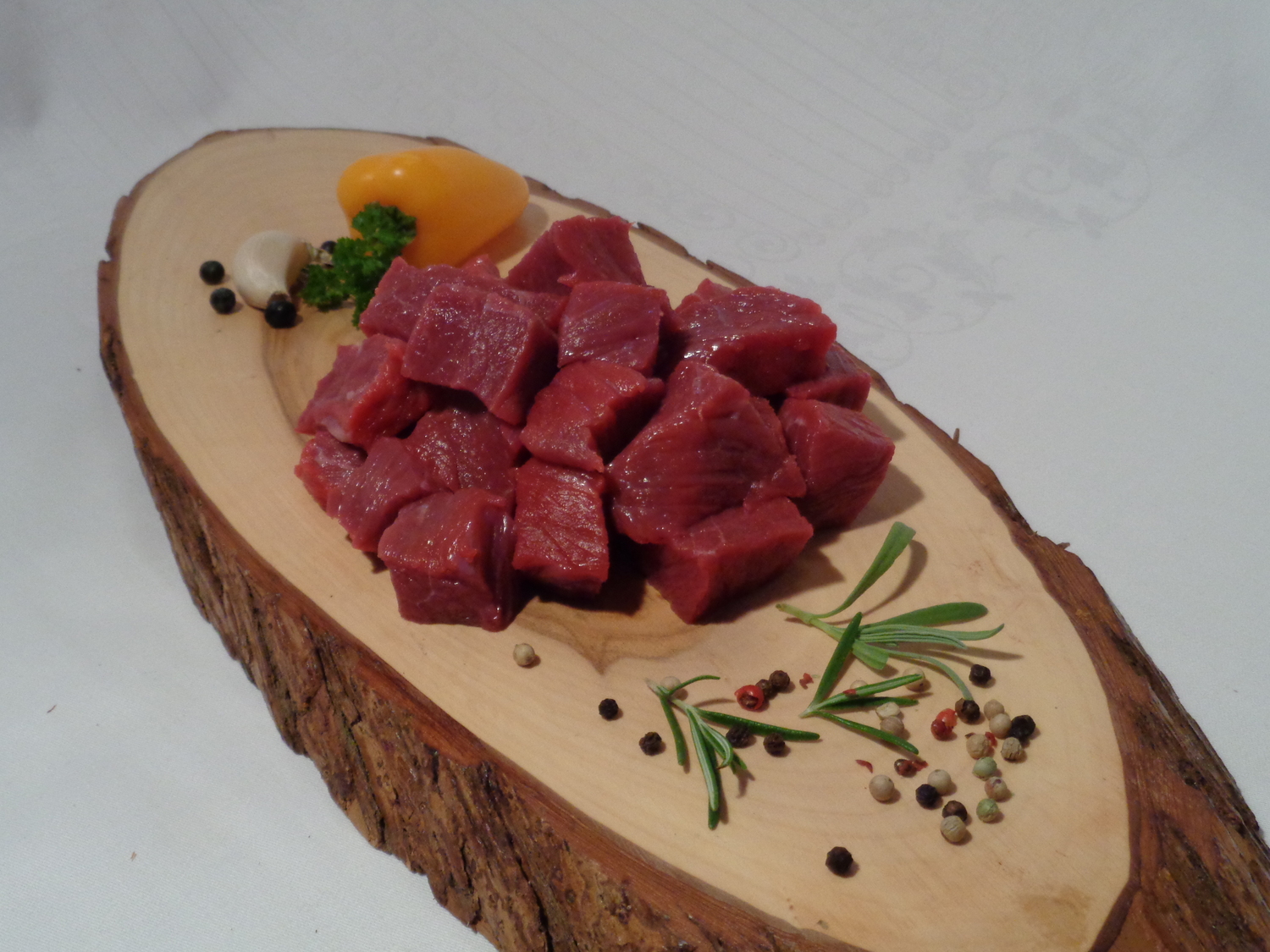 Von Hand in Würfel geschnitten. Mager und frei von Sehnen. Auf Wunsch können die Würfel auch auf eine bestimmte Größe geschnitten werden, einfach eine Kurze Nachricht hinterlassen.