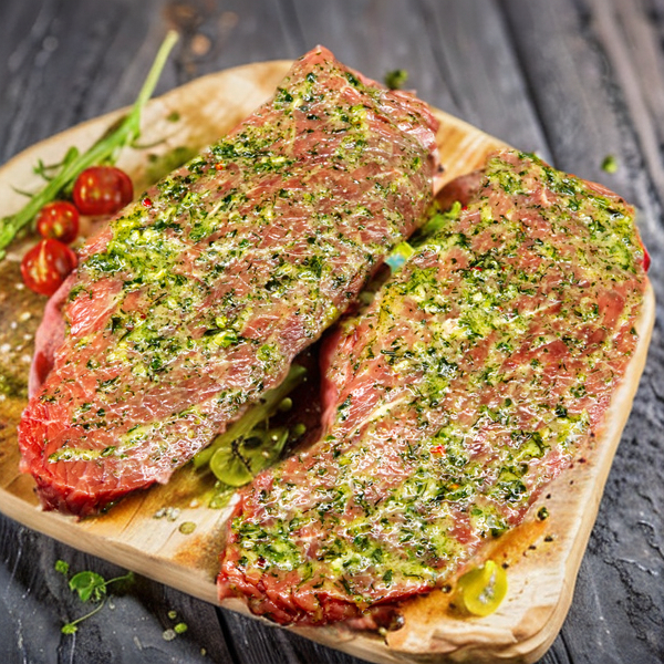 Fertig gewürzte Steaks (Knoblauch-Kräuterbutter-Marinade) aus der zarten Rinderhüfte