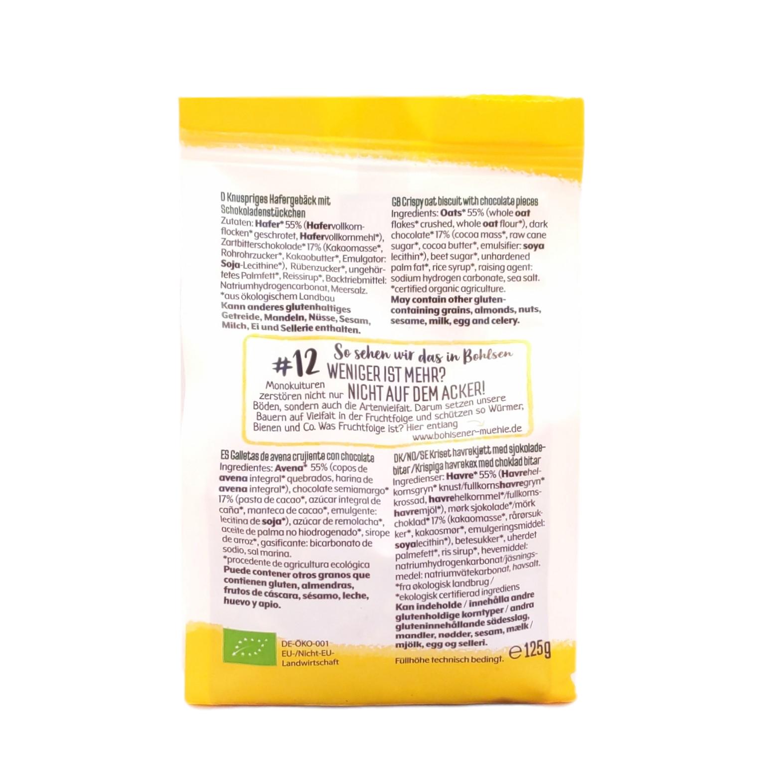 Hafer* (55%) [Hafervollkornflocken* geschrotet, Hafervollkornmehl*], Zartbitterschokolade* (17%) [Kakaomasse*, Rohrohrzucker*,Kakaobutter*, Emulgator: Soja-Lecithine*], Rübenzucker*, ungehärtetes Palmfett*, Reissirup*, Backtriebmittel: Natriumhydrogencarbonat, Meersalz.