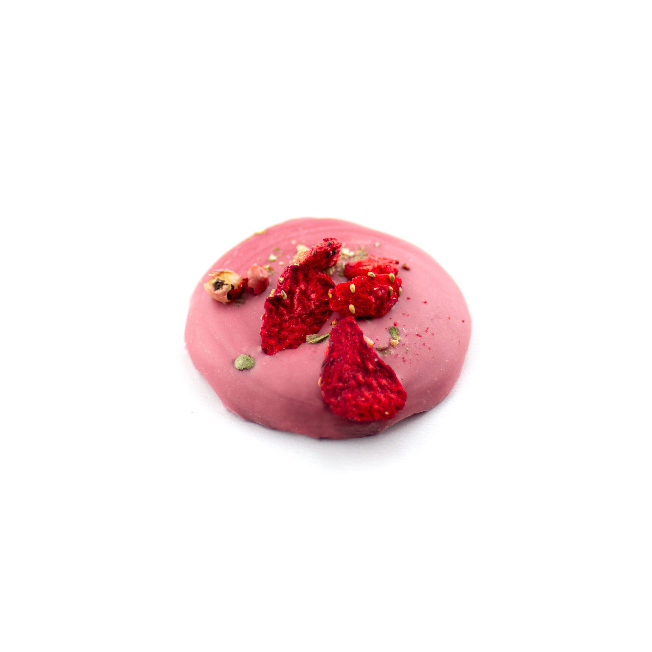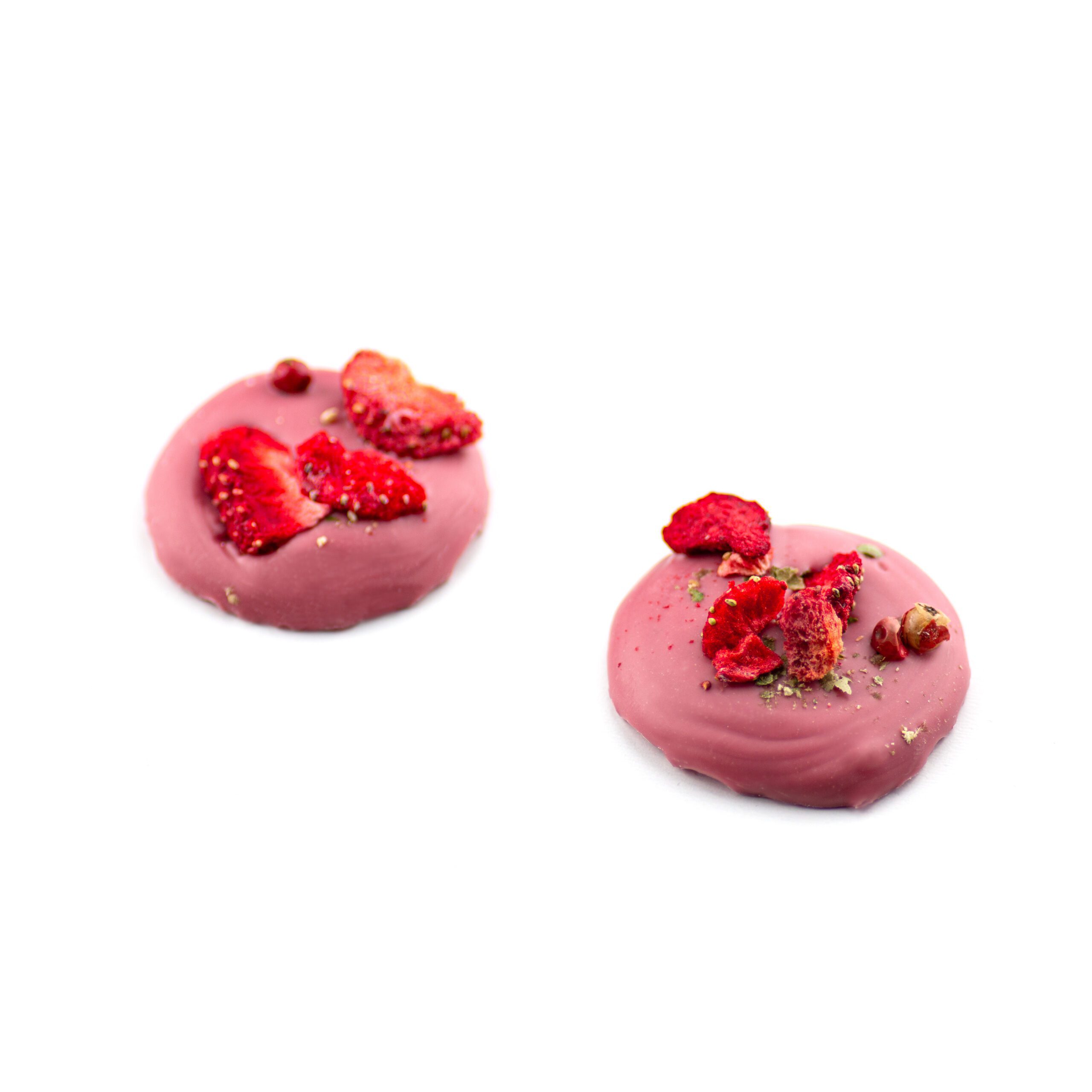 8 handgeschöpfte Ruby Schokoladentaler (Kakao: 47% mindestens) mit getrockneten Erdbeeren und grünem Pfeffer.
