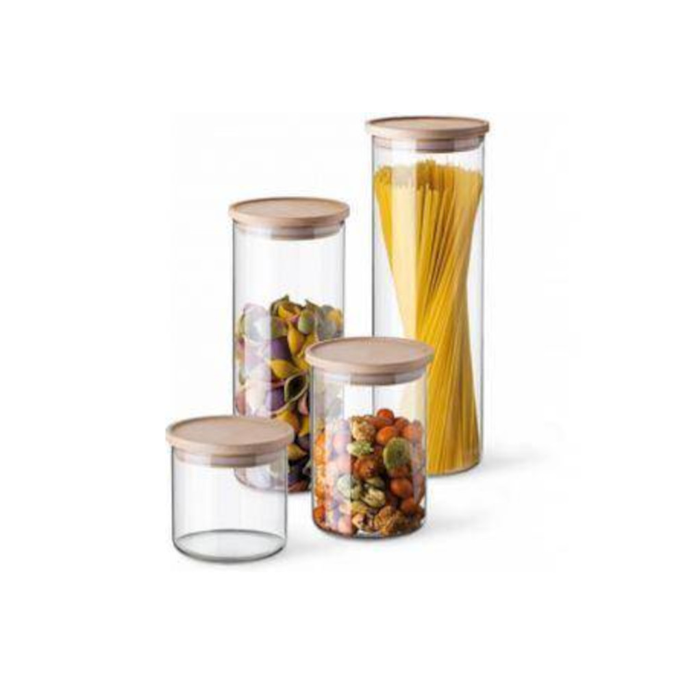 Praktische Vorratsgläser aus hitzebeständigem Glas mit Buchenholzdeckel. Erhältlich in 4 Grössen.