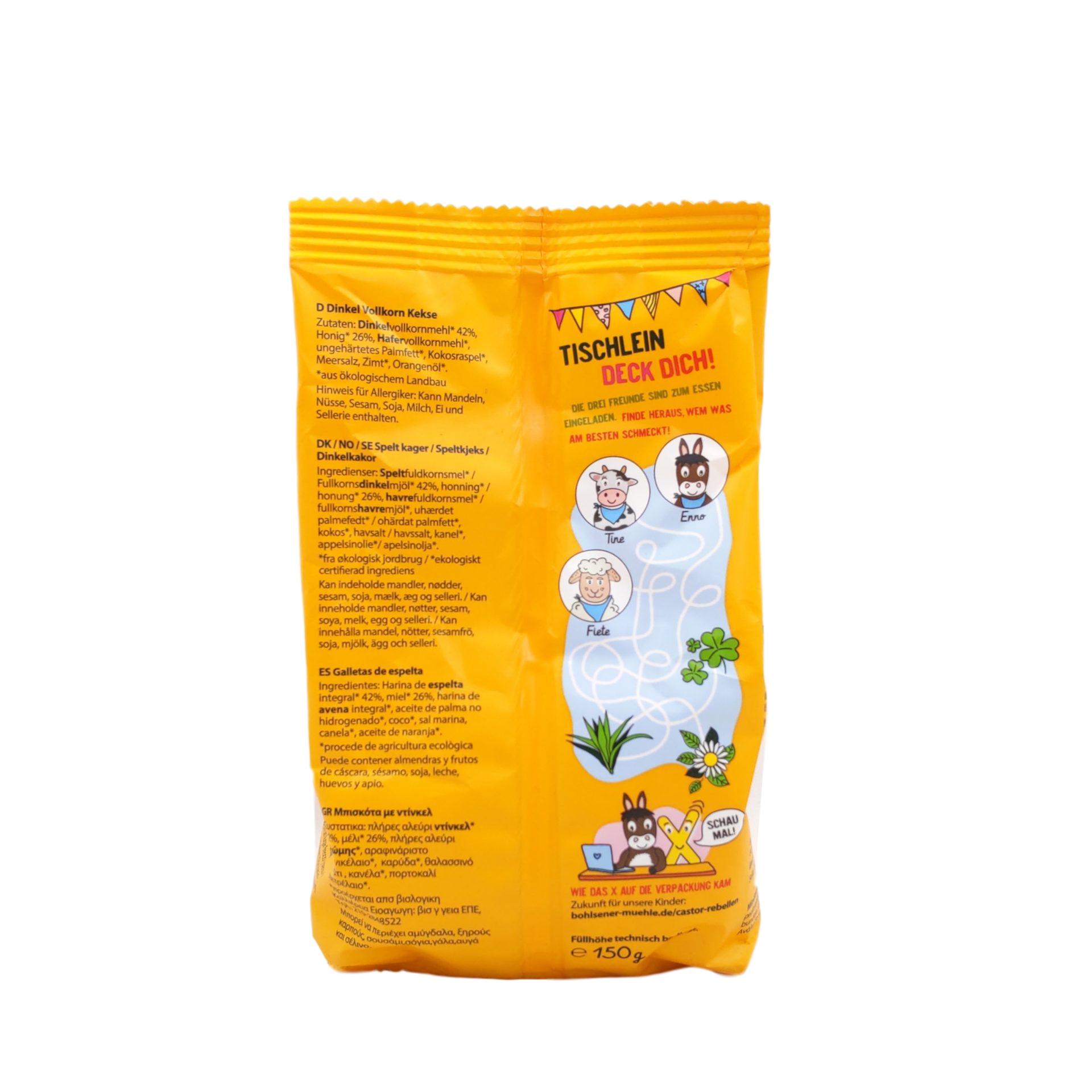 Dinkelvollkornmehl* (42%), Honig* (26%), Hafervollkornmehl*, ungehärtetes Palmfett*, Kokosraspel*, Meersalz, Zimt*, Orangenöl*.