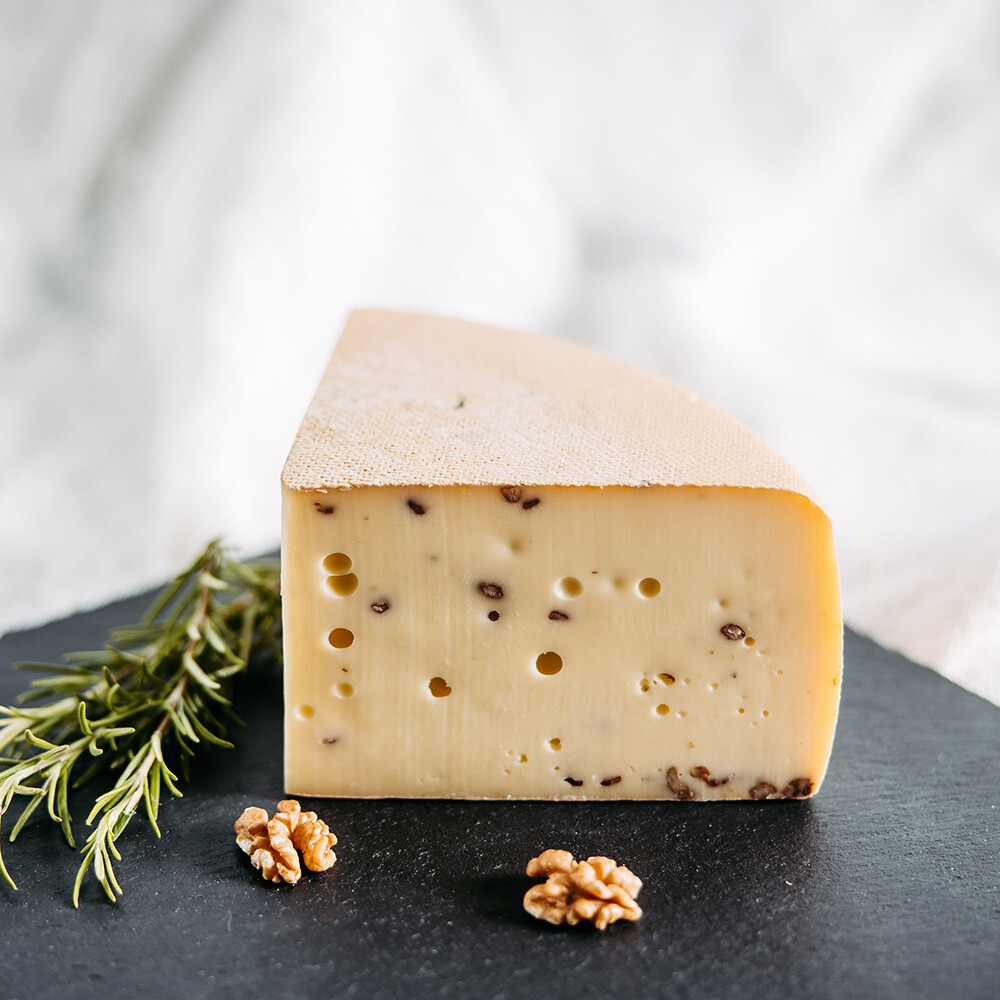 Unser Walnusskäse ist ein feiner Schnittkäse aus Bregenzerwälder Heumilch, mit Walnusskernen im weichen Teig, welche den Käse in Aroma und Geschmack dominieren. Am Gaumen fühlt sich der Käse geschmeidig und elegant an. Ein besonderes Geschmackserlebnis mit den feinen Walnusskernen und dem mild-würzigen Aroma. F.i.T. ca. 50% | mind. 3 Monate gereift. Ein Laib hat ca. 6 kg