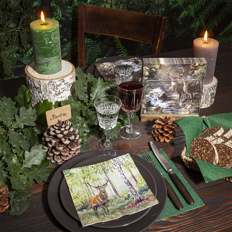 Entdecken Sie die eleganten Wild Deer Servietten mit ihrem majestätischen Hirschmotiv für eine stilvolle Tischdekoration.