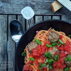 Spaghetti mit Meatballs in Tomatensoße mit Parmesan und frischem Basilikum